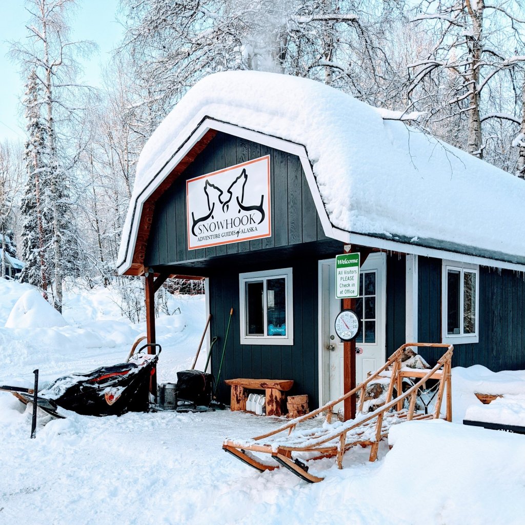 It was a beautiful day for dog sledding. The trees were covered with snow from the previous day’s snowfall and the sun was shining brightly. We pulled into the half mile tree lined driveway leading up to Snowhook Adventure Guides of Alaska and parked next to a small cabin. As we headed into the cabin another group was just leaving, gushing about how much fun they had. My husband and I were in Willow, Alaska about 90 miles north of Anchorage and excited to try dog sledding for the first time. We were greeted by one of our guides who helped make sure we had the right gear to keep us warm. The temperature was 15 degrees (which growing up in Minnesota we considered acceptable), and we were provided with warm outerwear including coveralls, boots, and gloves. Once we were bundled up, it was time to meet the dogs!