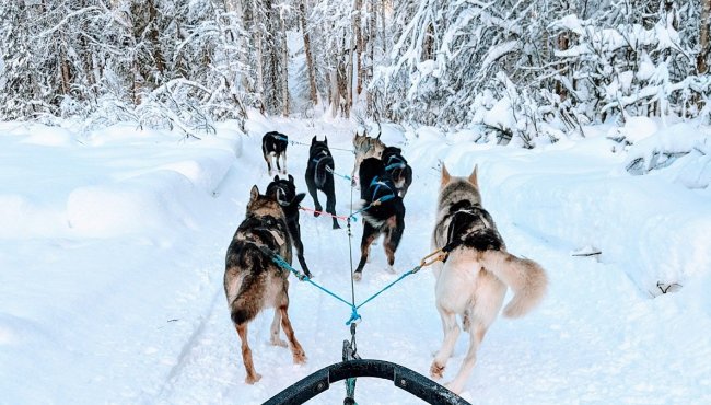 Finally, it was time. Eight dogs pulled our sled. I sat on the sled with the simple instructions to hang on tight, the guide stood behind me, and my husband stood on the back of the sled behind the guide where he was given a few more instructions. These included making sure to keep your knees bent to help stabilize you as we went over bumps. He did say however, that if you felt like you were going to fall off, to just let yourself fall. Otherwise, you might end up tipping over the whole sled and the dogs could run away without us. He also told my husband that he didn’t need to worry about the brake, the horizontal beam near his feet. He said the only reason you would need to stand on the brake would be if he had to get off the sled for some reason. Then my husband would stand on the brake with both feet so the dogs couldn’t run away. He also said to just follow his movements going through the tree lined path to avoid the branches my husband might not be able to see. If he ducked, you ducked, if he leaned left, you leaned left. And lastly, he didn’t advise holding a phone to take pictures or video from the back of the sled because you needed to be able to hold on with both hands. Apparently, he had someone try and it didn’t end well for their brand new iphone.